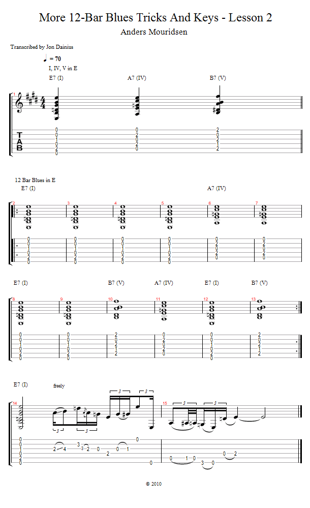 In this lesson we’ll be using the variation of the blues riff that you learned in the previous lesson to play through the 12 bar form in E. I’ll break it down for you, and then we’ll try it out with the backing track!